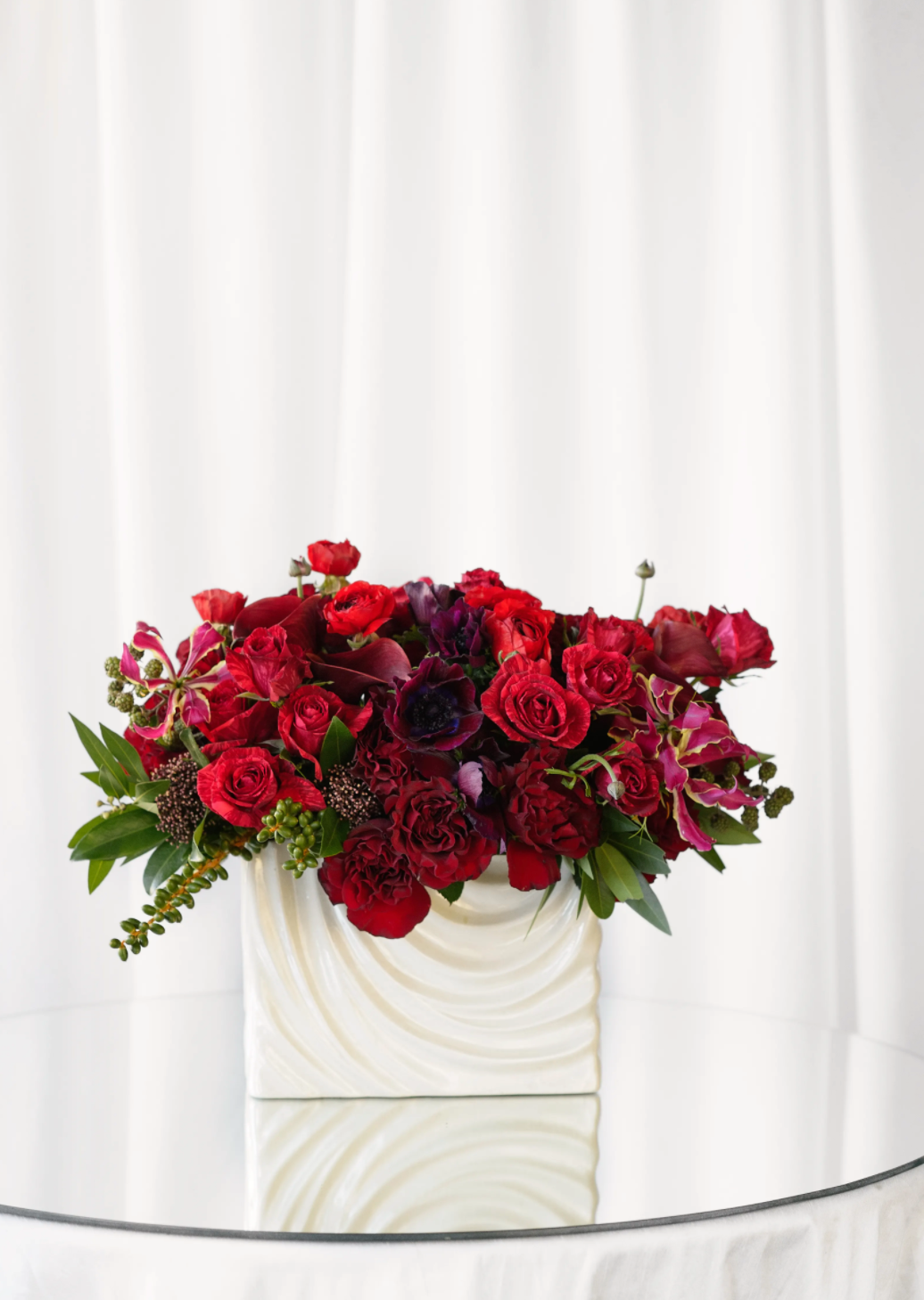 We build this bouquet with fresh red roses, deep plum callas, and layered textures that make the whole thing feel alive. Set in a soft ivory ceramic, the colors spill over just enough to feel untamed. Every stem is chosen with care to make your love speak clearly.