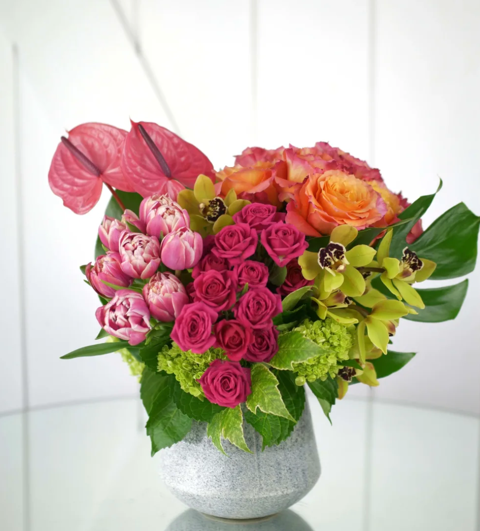Our designers will create a beautiful arrangement with the most magnificent blooms mother nature has to offer. We will do our best to provide you with an arrangement that replicates this beautiful design just note that we might need to make floral substitutions based on availability. We can promise though that your arrangement will be stunning, fresh, and knock her socks off!