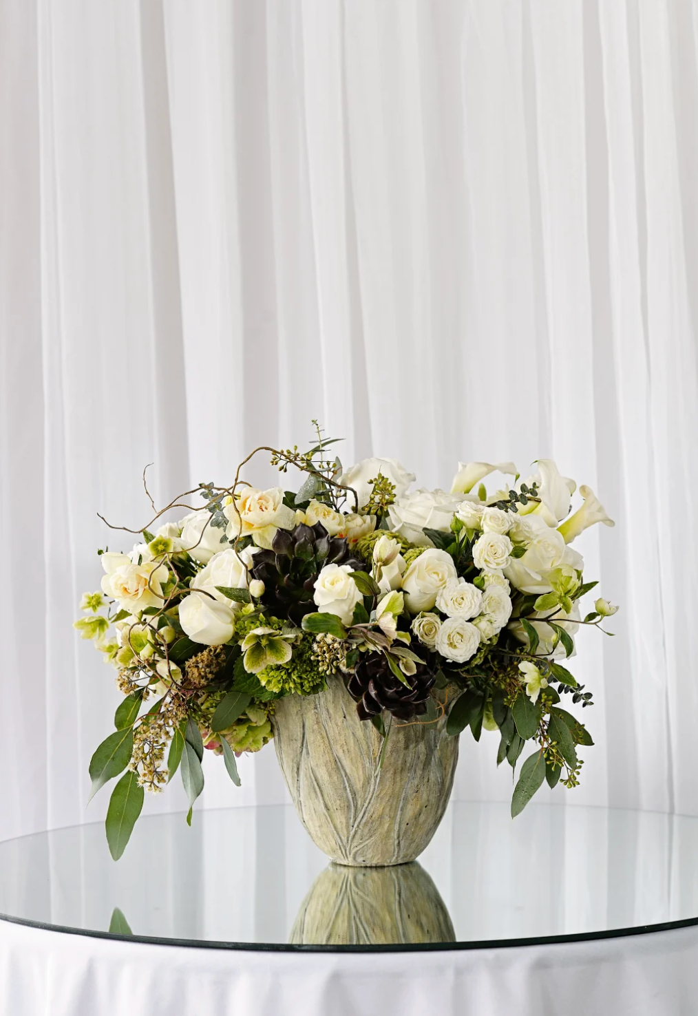 Roses, spray roses, mini callas, green textures, and succulent accents
