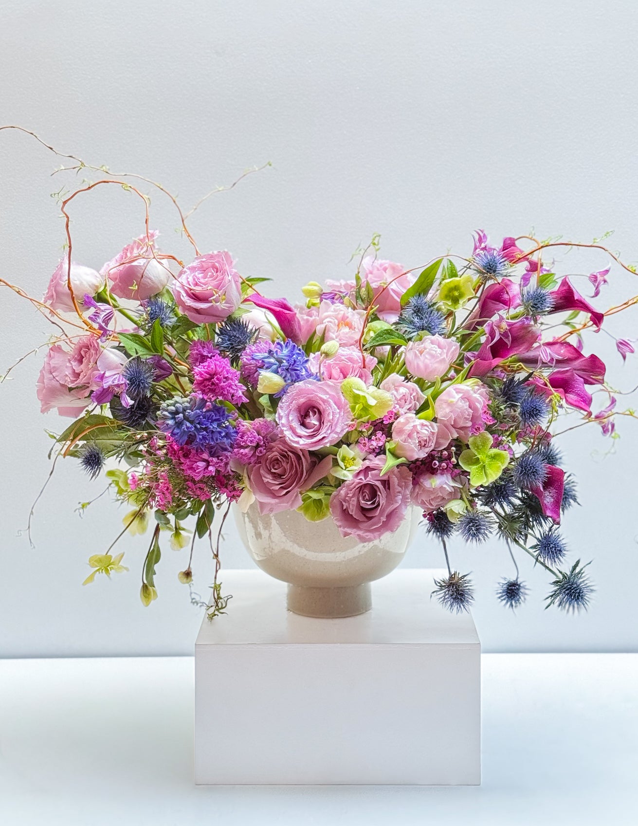 A sculptural arrangement featuring Willow, Calla lilies, Roses, Tulips, Hyacinth, Blue thistle, Clematis, Hellebores, Wax-flower, and finished with seasonal greens.