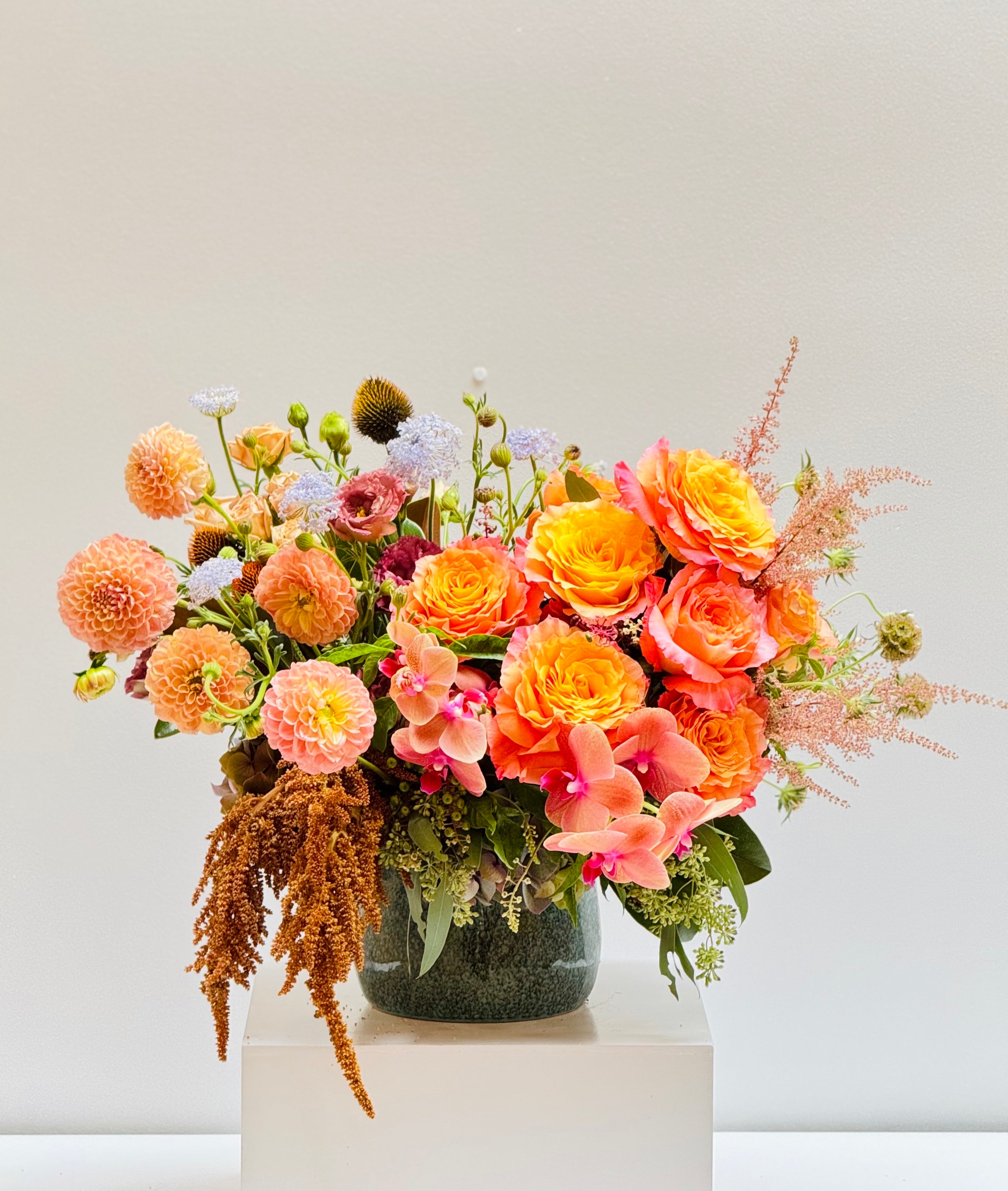 A dreamy blend of harvest textures and blooms—golden dahlias, whimsical echinacea pods, airy lace flower, and feathery astilbe. Orchids and roses bring a touch of elegance, while cascading amaranthus and seeded eucalyptus add that perfectly rustic orchard charm.