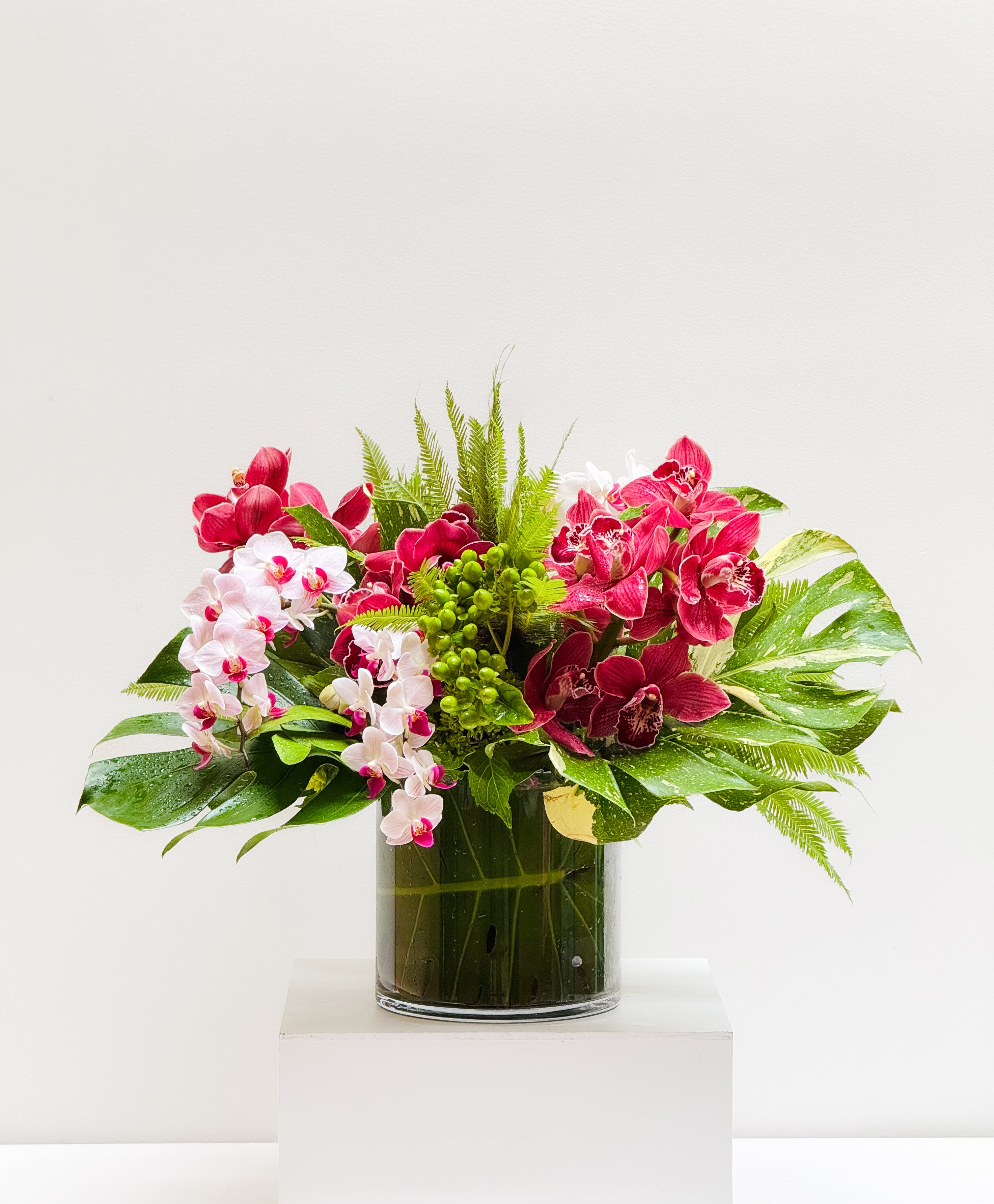 A tropical ambiance with Cymbidium, Phaleys, Umbrella Fern, Hypericum, and Monstera. This design is so stunning and will surely impress.