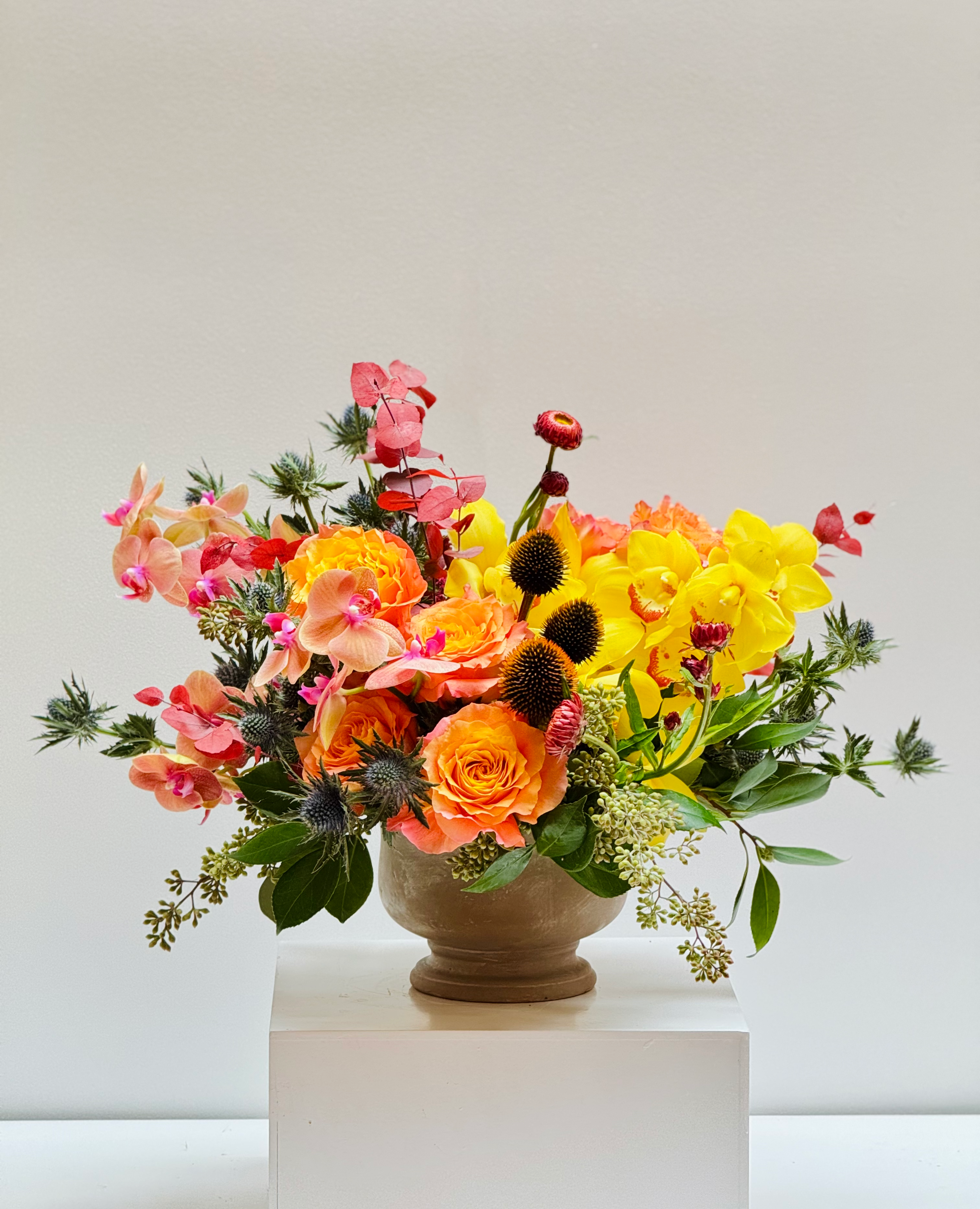 A striking mix of textures and blooms—roses and phal orchids bring elegance, while thistle, echinacea pods, strawflowers, and seeded eucalyptus add rustic charm. Cymbidiums lend a touch of exotic beauty, creating a bold and whimsical arrangement. 🌿✨