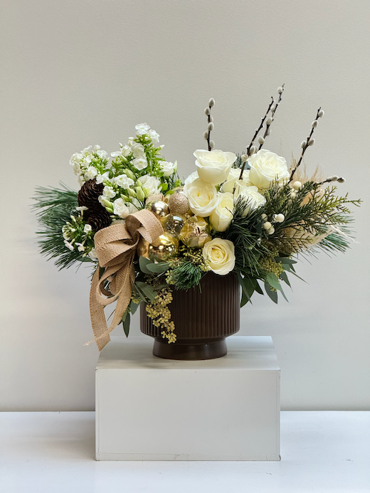 "Let it Snow" is the perfect addition to your holiday decor. With ornaments, delicate roses, ribbon, and vibrant greenery, it brings a touch of nature and elegance to any space. Add some festive charm and warmth to your home with this stunning arrangement.