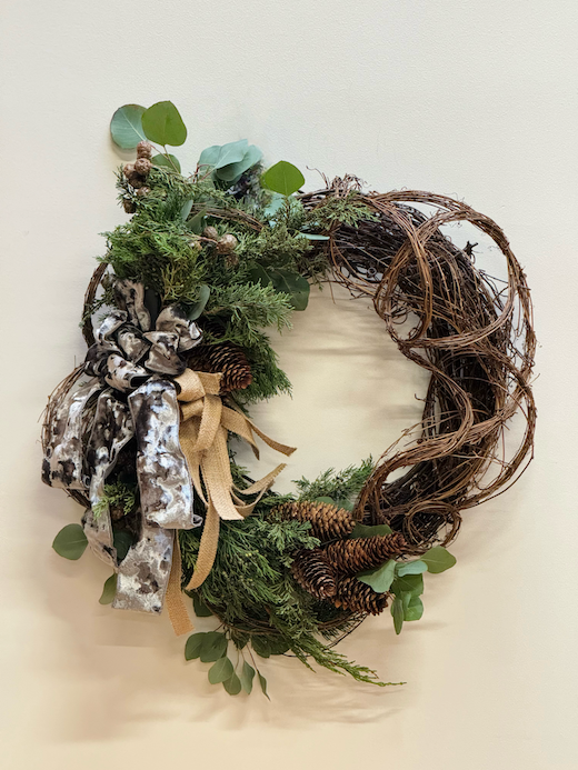 Welcome holiday visitors with a festive entry piece. Our wreath is handcrafted with intricate detailing, eucalyptus, grapevine, and ribbon to match! This will surely wow your guests!