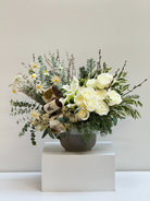 The Woodsy Winter arrangement is the perfect addition to your holiday decor. With fresh eucalyptus, delicate roses, and vibrant greenery, it brings a touch of nature and elegance to any space. Add some festive charm and warmth to your home with this stunning arrangement.