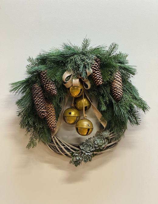 Welcome holiday visitors with a festive entry piece. Our wreath is handcrafted with intricate detailing, pinecones, bell/bells, greenery, succulents, and ribbon to match! This will surely wow your guests!