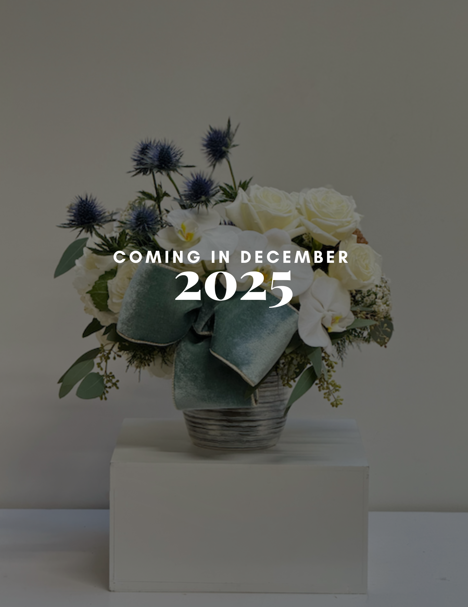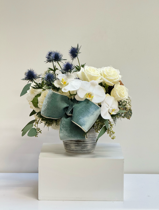 The Winter Celebration features a stunning array of blue and white flowers, adorned with an embellished bow at the front. Perfect for any setting during the holidays.