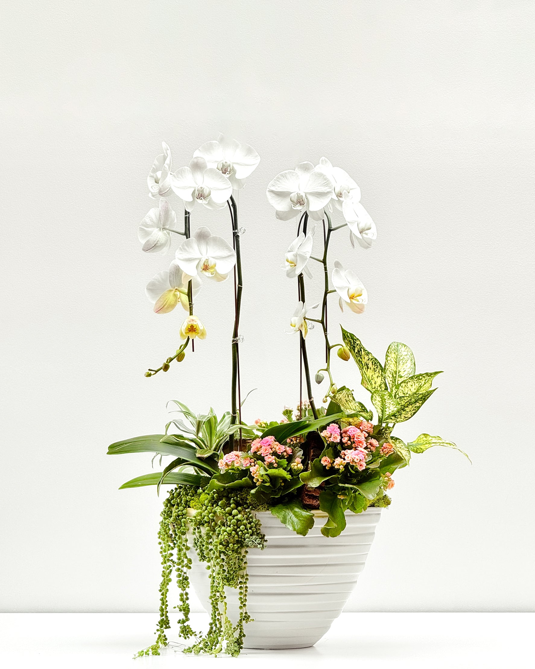 A delicate blend of Phalaenopsis Orchids, String of Pearls, Kalanchoe, Variegated foliage, Reindeer Moss, and a touch of crystal dowel. A thoughtful, elegant piece—just right for making Mom’s Sunday feel extra special.