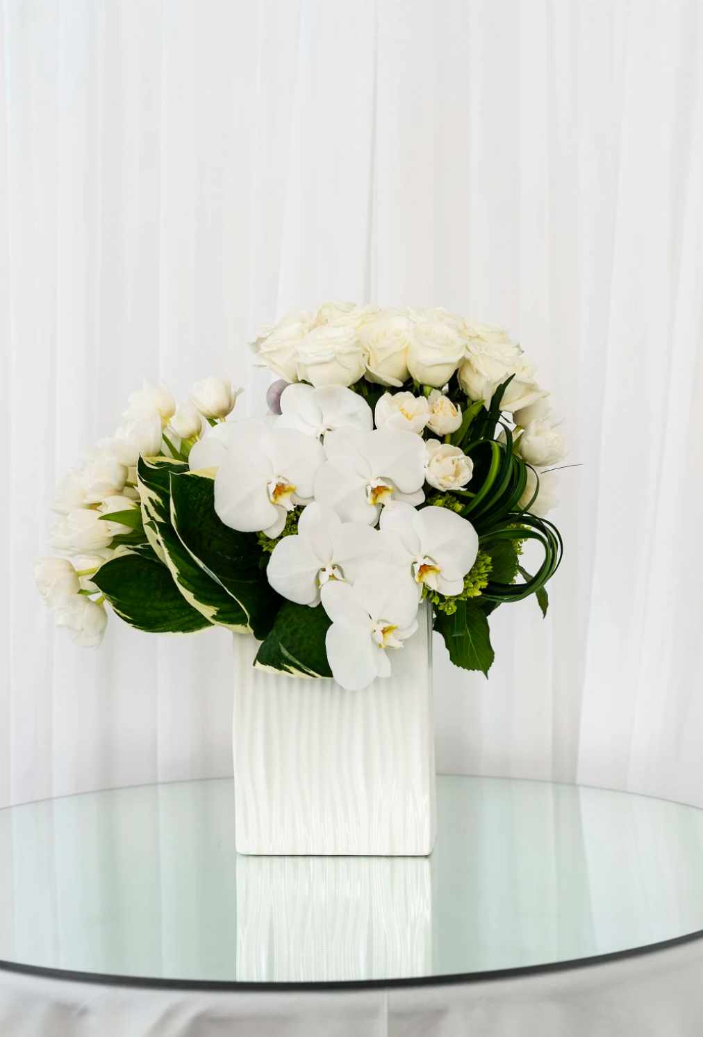Classic white roses, orchids, tulips and interesting green leaves