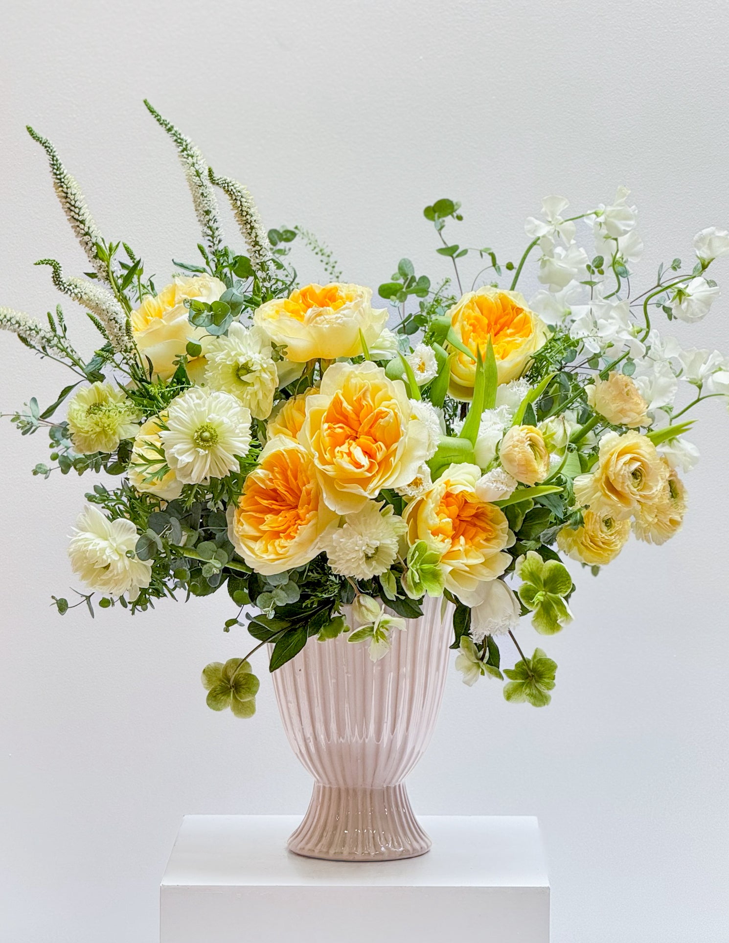 A timeless arrangement featuring Roses, Anemones, Hellebores, Veronica, Sweet Pea, Ranunculus, Gunnite, and Thlaspi, finished with seasonal greens.