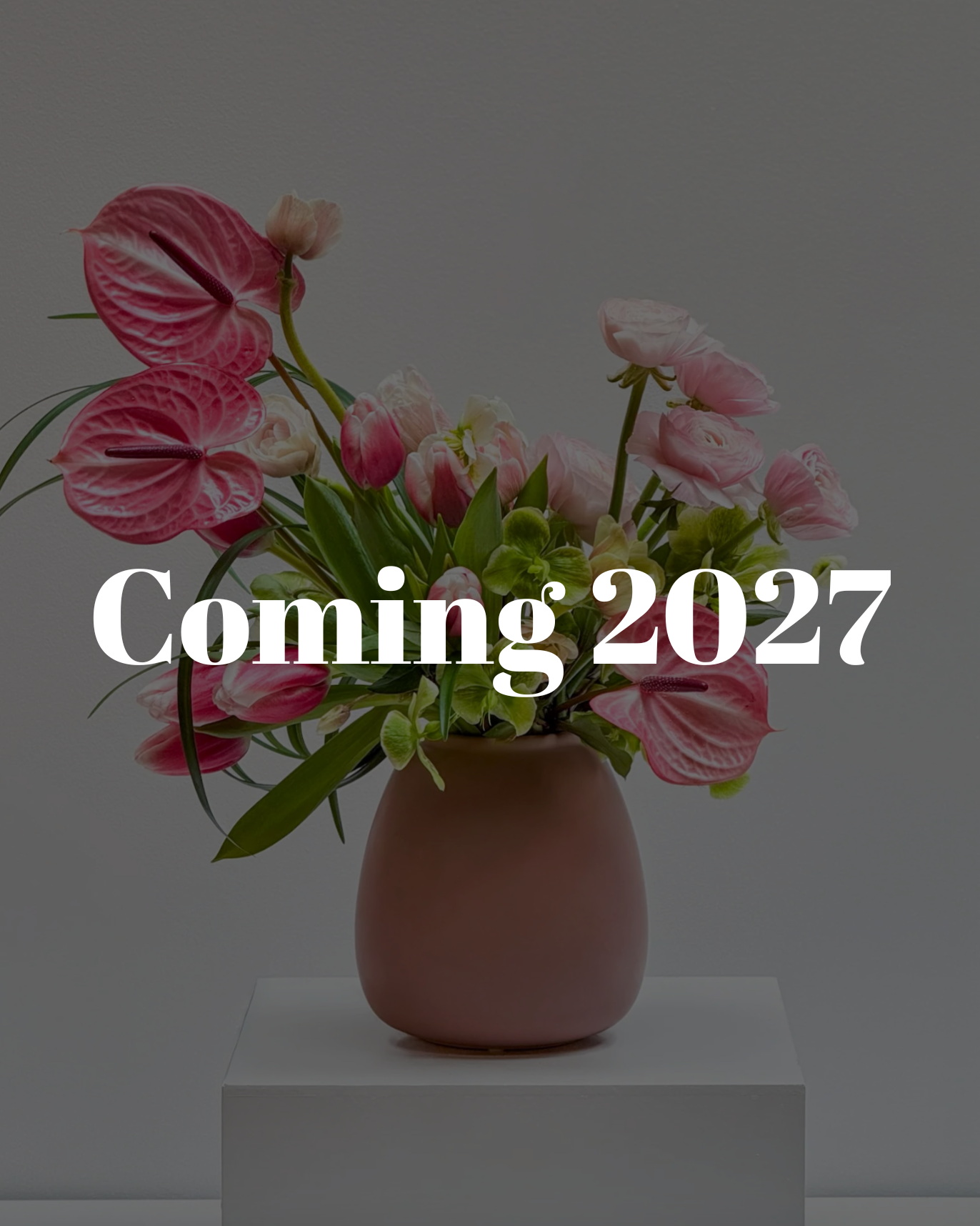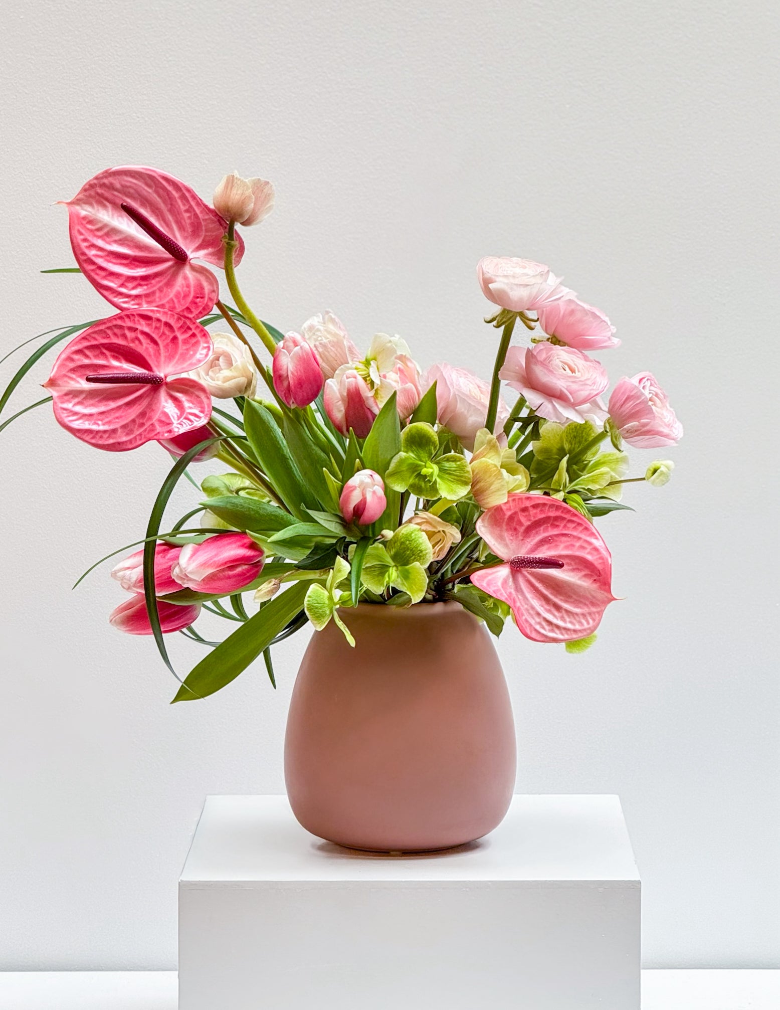A playful arrangement featuring Ranunculus, Double Tulips, Anthurium, Lily Grass, Hellebores, and Anemones, finished with seasonal greens.