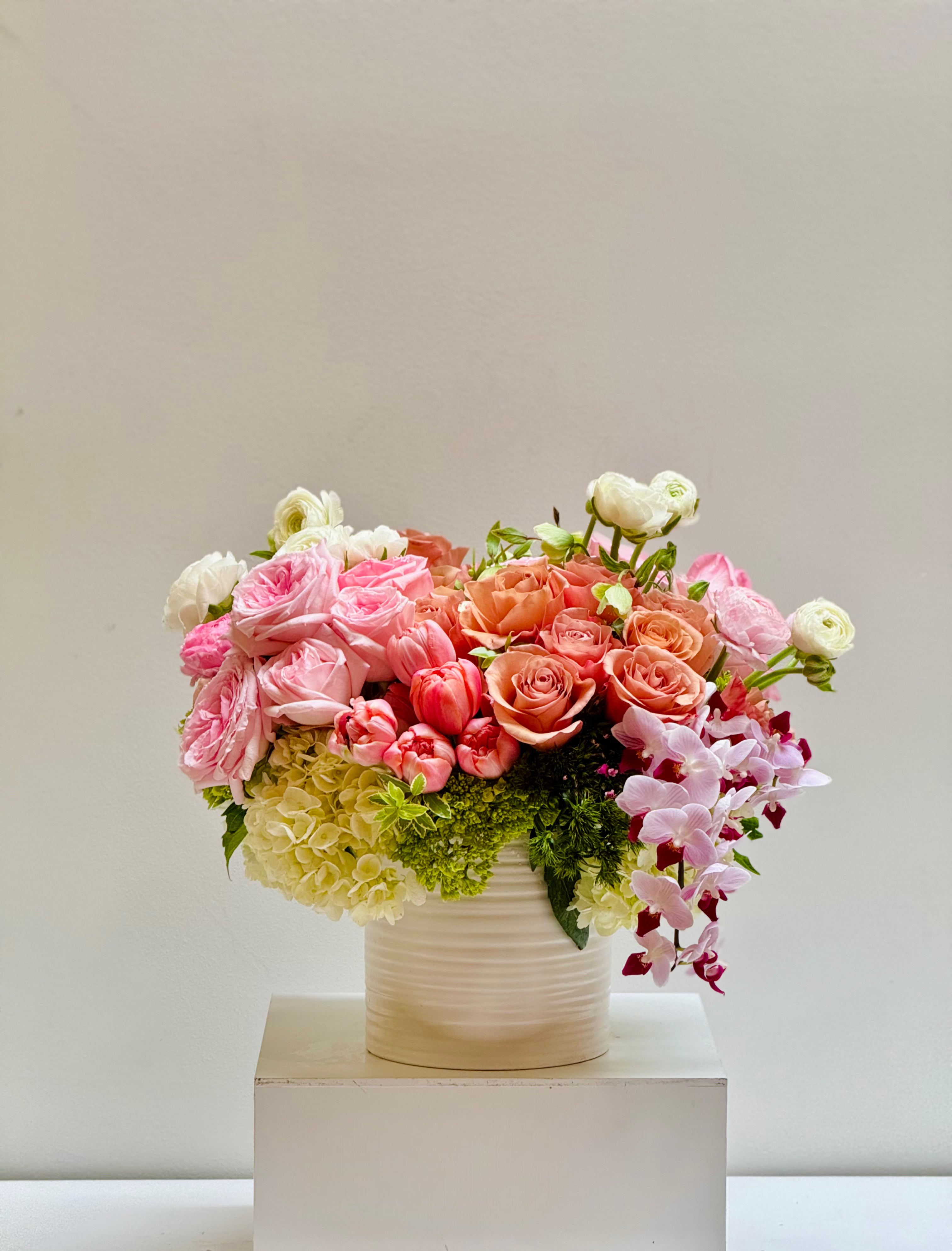 A beautiful spring arrangement with Hydrangea, Tulips, Ranunculus, Hellebores, Pittosporum, Roses, and Orchids. This design is so stunning and will surely impress.