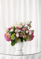 A soft and sweet arrangement including hydrangea, roses, Anemones, ranunculus, parrot tulips, and other beautiful textures